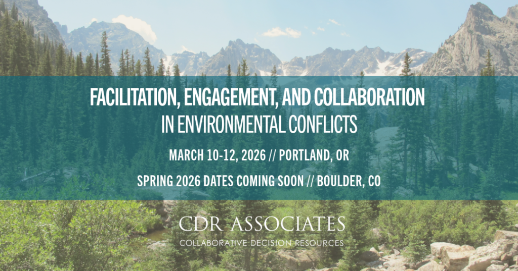 We are thrilled to present two trainings on Facilitation, Engagement, and Collaboration in Environmental Conflicts in 2026: Portland, Oregon (March) and Boulder, Colorado (Spring 2026 - Dates Coming Soon).